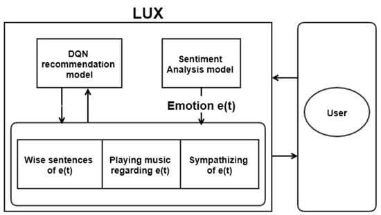 We implemented reinforcement learning (RL) as a recommender system for a user’s emotion and the actions that correspond to it. We randomly choose the three methods; however, the recommender system algorithm would provide more precise results to secure the experimental user group. We proposed a recommender system based on a deep Q network (DQN) to select the proper response. DQN is adequately used in the recommender system to recommend better sources to users and evaluate the algorithm according to the feedback [34]. State would be the emotional state of the user, as given by Algorithm 1. Action is the set of responses in Table 2—the discount factor as , and the epsilon for exploring as . The discount factor is set to 1, so that past results affect the existing sentence without exception, while the existing user response does not fade away. We defined the reward as and the replay buffer as . The proposed DQN model is , and the target model of . If the user likes a given response, they can provide a binary reward. Through the model, LUX can select the proper response to the user. The proposed method is summarized in Algorithm 1 and Figure 4.
