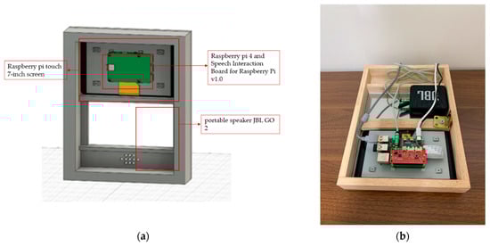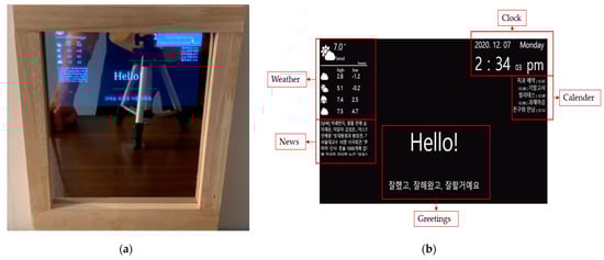 LUX consists of a Raspberry Pi Touch 7-inch screen, Raspberry Pi 4, portable speaker JBL GO 2, Speech Interaction Board for Raspberry Pi, and an auxiliary battery. The front case is an invisible acrylic attached to a half mirror film that functions as a mirror. As an advantage of a smart mirror, we can implement a beautiful design using woods connected with horizontal brackets. Similar to existing smart mirrors, our display presents the user’s location’s calendar and weather, as shown in Figure 6. The front of LUX is described in Figure 6a. The edge of the mirror is made of wood, and if the user turns it off, it also functions as a standard mirror. The graphic user interface of LUX that displays weather, a clock, a calendar with the user’s schedule, and news, similar to what existing smart mirrors provide, are shown in Figure 6b. The speaker module inside LUX can be activated by a wake-up prompt. The concept of design and overside of the hardware is described in Figure 7a. It shows the space for the Raspberry Pi Touch 7-inch screen, battery, speaker, and microphone modules. The back view of the hardware, shown in Figure 7b, includes all the internal components.