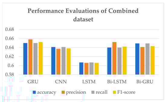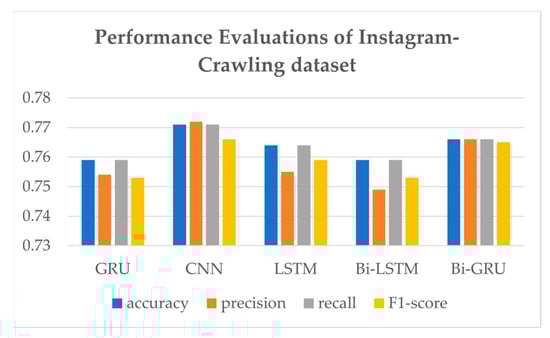 A comparison of the performance evaluations of various models with combined datasets is presented in Figure 8 and Table 3, rounded to the fourth decimal place. In the experiment result, the accuracy of SVM is so low (as low as 0.4) that its result is not included in the comparison results. Deep learning models such as LSTM [23], CNN [25], Bi-LSTM, Bi-GRU, and GRU are compared for sentiment analysis of Korean sentences. It shows that GRU shows the highest performances in the combined dataset. Also, since the bidirectional models’ training time was five times higher than other models, we selected GRU network as a deep learning sentiment analysis model for LUX. GRU presents an f1-score of 0.652, which is the highest. Table 3 also shows GRU accuracy and recall of 0.650 and precision of 0.658, which are the highest. LSTM shows the lowest performance evaluation among the models.