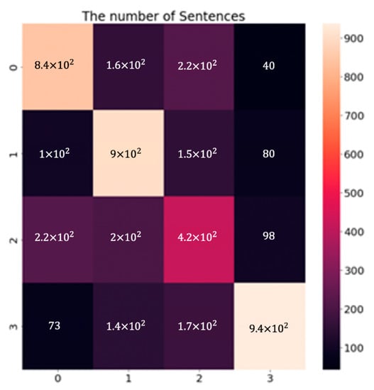 The performance evaluations of the GRU model to compare each label are shown in Table 4. The confusion matrix of the GRU model with the combined dataset is shown in Figure 9. Data labels match the numbers 0, 1, 2, and 3 to anger, sadness, neutral, and happiness, respectively. The numbers describe the numbers of the data. We can confirm that the last label, “happiness” demonstrates outstanding performance. As shown in Table 4, the remaining results are 0.681, 0.642, 0.434, and 0.809 for precision, 0.667, 0.730, 0.447, and 0.705 for recall, and 0.674, 0.683, 0.440, and 0.753 for the F1-score of each category. We guessed that the lower performance evaluation of the “neutral” label is due to its inherent vagueness in terms of classification.