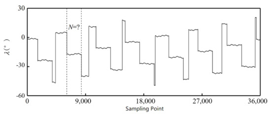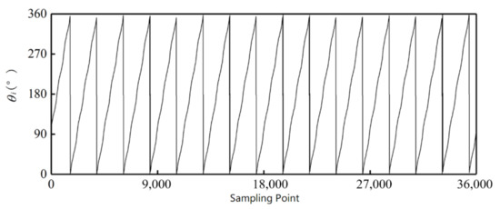 Table 1 shows the calculated characteristic value and its relationship with pole position. Then the absolute angle can be calculated through Formula (1). Figure 16 shows the corresponding relationship between sample points and pole positions, and Figure 17 shows the calculated absolute angle. Because the pole position of the first sample point is set at 16, the start point of the absolute angle in Figure 17 is not zero.