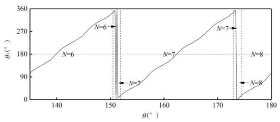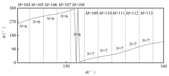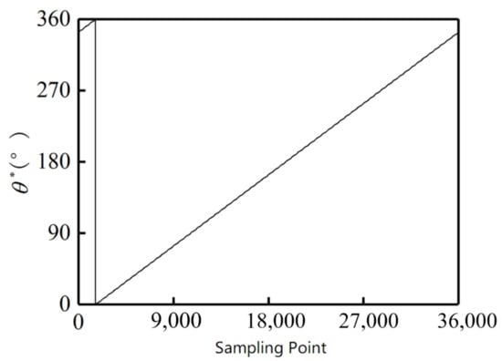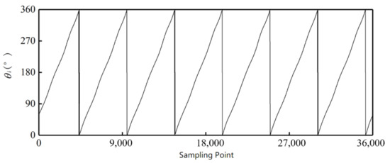- If the interval of a sample point does not belong to , there will be no pole position change in the interval. Then the pole position of the point is the same as that of the interval. If the interval of a sample point belongs to , then the point may be the intersection of pole positions. If the angle of the point is greater than 180°, its pole position is 1 less than that of the interval; if the angle of the point is greater than 180°, then its pole position is the same as that of the interval. After the processing, the corresponding relationship between the single-cycle angle and pole position can be determined. The partial result is shown in Figure 10.