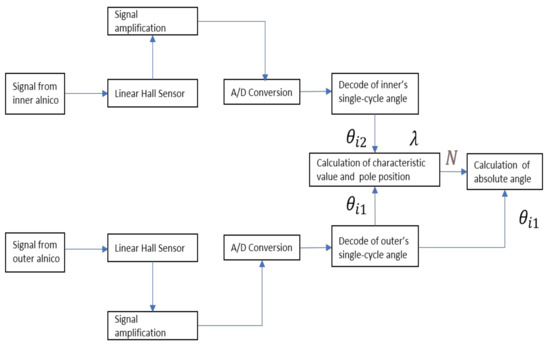 Figure 1 shows the schematic of the magnetic encoder’s signal generation principle. Two multi-pole alnico rings are installed on a motor’s rotary shaft coaxially and rotate with it, outputting a magnetic signal that correlates with angle. Four Hall linear sensors are installed around alnicos at equal spacings. These sensors collect a magnetic signal and then send it to the MCU. Finally, the absolute angle can be calculated after the MCU is processed.