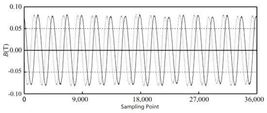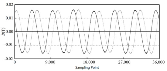 The position of the Hall sensors is the start point, the sampling points are taken as the abscissa, and the magnetic field intensity is the ordinate. Figure 12 shows the signals of Hall sensors H1 and H2 around the outer alnico, and Figure 13 shows the signals of Hall sensors H3 and H4 around the inner alnico. The solid curves are the signals of H1 and H3, and the dashed curves are those of H2 and H4.