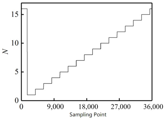 - Use the value of the first sample point in interval to subtract the value of the first sample point in interval . Then differences are obtained. Figure 7 shows a partial curve of and its corresponding intervals.