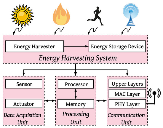 General schematic of an IoT node equipped with energy harvesting.
