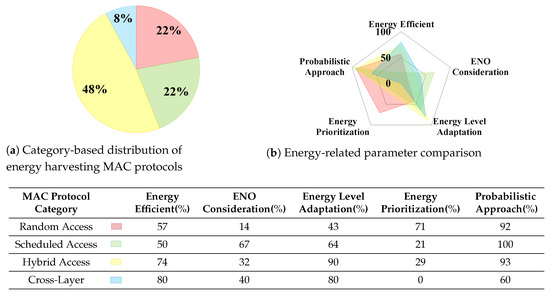 One of the latest classifications of energy harvesting MAC protocols is proposed in [22], where in addition to sender/receiver-initiated divisions are used by the aforementioned survey papers, approaches such as scheduled-based access protocols are included in this classification. Then, some energy harvesting MAC protocols’ functionality is explained based on the MAC layer requirements in IoT systems. Although this work includes a much more comprehensive number of energy harvesting MAC mechanisms than the previous surveys, the authors do not provide any information regarding the harvesters’ available energy, which is required to optimize the MAC layer operations.