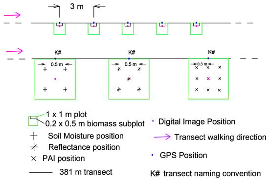 We collected field data three times in the growing season (spring, summer, and fall). The data collected in 1 × 1 m quadrats along the transect included functional vegetation cover, ground hyperspectral data, plant area index (PAI), biomass, soil moisture, and landscape structure (Figure 3). In addition, we collected shrub cover and density with the line intercept transect (LIT) method in spring. Digital images were collected at nadir view above the center of each quadrat and 3D coordinates of each were obtained in UTM13N with the use of a Differential Global Positioning System with positional accuracy of less than 1 m.