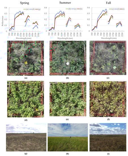 Spectral signatures that correspond to images (a–i) which are representative per season. Quadrat K36 with 25–45% shrub cover in (a) spring (9 June 2020), (b) summer (3 July 2020), and (c) fall (3 September 2020). Quadrat K96 with 60–80% shrub cover in (d) spring (11 June 2020), (e) summer (6 July 2020), and (f) fall (4 September 2020). Landscape pictures along the total study transect (128 quadrats) in (g) spring (27 May 2020), (h) summer (6 July 2020), and (i) fall (4 September 2020).