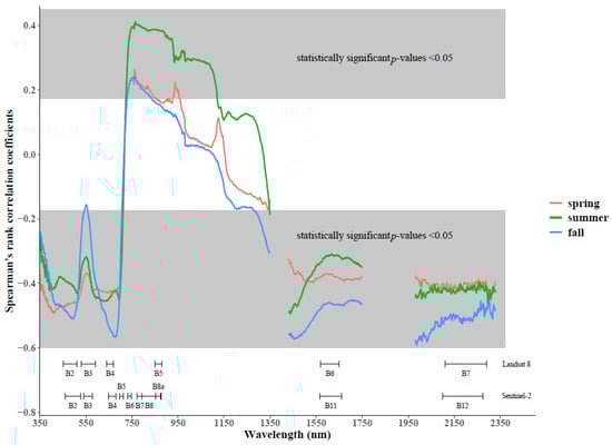 Within the visible region, the negative correlation (between −0.48 and −0.47) for all seasons in the blue region (around 420 nm) is more significant during spring and fall than for summer. This could be related to the stronger chlorophyll absorption during summer. Similar patterns are observed for the blue-green (495 nm) and red (680 nm) regions, where the start of shrub senescence and decrease in chlorophyll absorption leads to stronger negative correlations during fall (−0.51 and −0.56 respectively). The green peak (around 550 nm) is clearly less significant for all seasons and more so in the fall due to the lower chlorophyll content. The positive correlation in the NIR region (around 760 nm) is higher in the summer (around 0.39) and can be related to the higher reflectance of shrubs due to the scattering of their internal leaf structure in that season. For the SWIR region, we see strong negative correlations (−0.49 and −0.56) around one of the main water absorption features (1430 nm) during summer and fall respectively, and less stronger ones during spring (−0.33). This might be related to the increase in water holding capacity for shrubs during fall, when their transpiration is lower than summer and spring [,], compared to grass species. This can also be explained by the average increase in soil moisture from spring to fall along the quadrat (see Section 4.1). Lastly, in the far SWIR, we see the strongest negative correlation (−0.57) around 2000 nm for the fall season, which could again be explained by the higher water holding capacity of shrubs during fall.