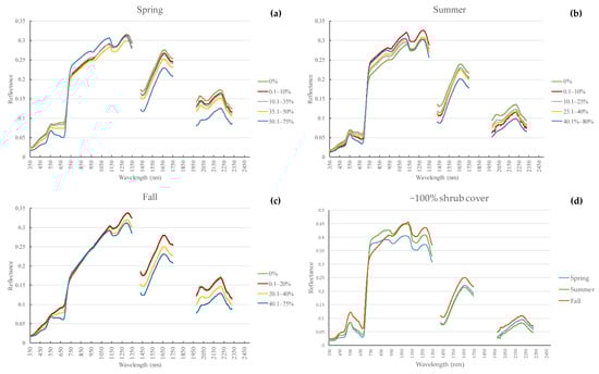 Average spectral response for shrub cover groups in (a) spring, (b) summer, (c) fall, and (d) 100% shrub cover over the three seasons ((d) was presented in a separate figure to remove its overshadowing effect).