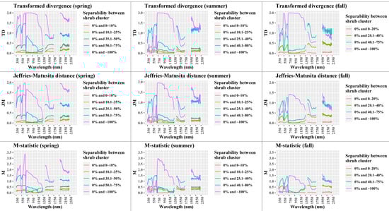 As a next step, we classified the TD, JM, and M metrics for all seasons and groups based on the set thresholds. We selected those shrub groups that provide moderate or good separability and calculated the percentage of wavelength bands that contribute to each separability class (Table S4). The TD metric suggests higher number of wavebands that are important for separating shrub cover compared to the JM metric (24.1% more). Whereas, for the M metric, it is not possible to differentiate between moderate or good separation. It is clear that the spring season offers a higher number of bands with moderate and good separability across all three metrics (64.3% on average) compared to the summer and fall season (44.8% and 27.6% respectively). This is again an indication towards the preferable selection of the spring season for shrub monitoring.