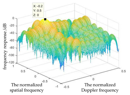Moreover, the normalized spatial frequency and temporal frequency (Doppler frequency) are respectively = ωs⋅λ/2π and = ωt⋅λ/2π. Meanwhile, there is an equation = β⋅, and β = 2V/dfr is the fold coefficient. Thus, the refined expression for the Equation (5) is: