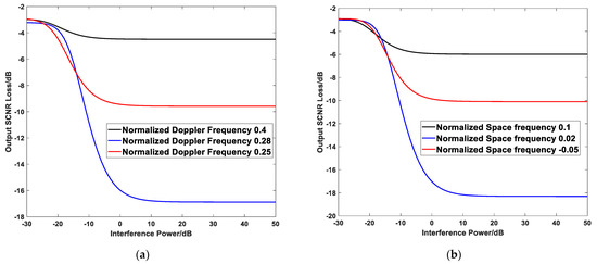 Figure 4a,b present the output SCNR loss simulation results varying with outlier power under different normalized Doppler frequencies and normalized spatial frequencies of the outlier. Table 1 provides the radar system simulation parameters.