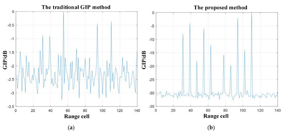 The simulation results of GIP value and output SCNR, they should be listed as: (a) GIP value simulation results of the traditional GIP method; (b) Simulation results of the GIP value of the proposed method in this paper.