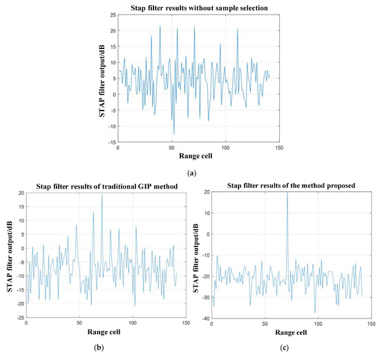 Figure 7a shows that the method without sample selection cannot detect any targets. Figure 7b shows that the position corresponding to the maximum output power value of the STAP filter obtained by the traditional GIP method is the same as that of the target. However, for most of the range cells, the output power corresponding STAP filter is also very high. It does not detect and eliminate the interference effectively. Moreover, the output power of STAP at the target position generates an SNR loss (relative to the set SNR = 20 dB). Therefore, it cannot guarantee the performance of target detection.