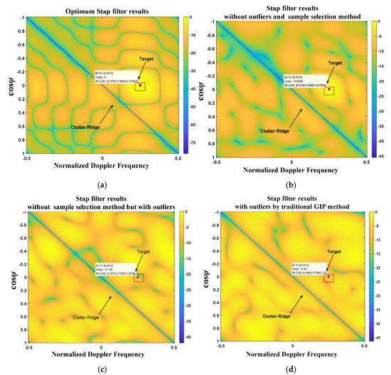 Figure 8b shows the STAP filter results with the sample matrix inverse (SMI) method when there is no outlier. The target response is 0 dB approximately. Moreover, there is a deep notch in the clutter, but not as deep as the Figure 8a;