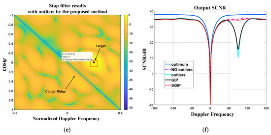 Simulation results of 2D space-time frequency response, they should be listed as: (a) Optimum STAP filter results (with actual ST−CCM); (b) STAP filter results without outliers and any sample selection method; (c) STAP filter results without any sample selection method but with outliers; (d) STAP filter results with outliers by traditional GIP method; (e) STAP filter results with outliers by the proposed method in this paper; (f) Comparison results of SCNR output by STAP filters with different methods.