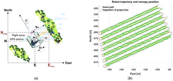 Precision agriculture relies on global positioning to precisely locate inputs, machines, crops, and yields in any given field. GNSS receivers, mostly GPS, are the universal devices to retrieve geodetic coordinates in real time, with a wide range of designs, accuracy, and cost. However, receivers always output the coordinates of the antenna, and inconsistencies may appear if accuracy is granted for the receiver but the antenna is poorly located with respect to the targeted objective. This is relevant for plant-specific applications, where the position of each plant or tree is what matters, but the antenna may be placed somewhere on the roof of the monitoring vehicle. This is understandable, however, due to the challenges of rendering canopies in real time, as it requires sensing the position of the canopy related to the vehicle in real time, as well as keeping track of the vehicle’s heading. However, when these two parameters are accessible, as explained in Section 2.2, it is possible to plot both, the vehicle’s trajectory and the position of the sensed canopy (Figure 1b). This is even more significant when a monitoring vehicle only senses on one side of the row. Equation (1) specifies the generation of canopy coordinates Ecrop (m) and Ncrop (m) for such a case, when the monitoring vehicle only senses the right side of the canopy and the GNSS antenna is located in an arbitrary place within the vehicle. Figure 1a schematizes this scenario where the 2D LTP coordinates of the vehicle (GNSS antenna) E, N (m) are known, the measurement of a right-looking distance sensor (e.g. a sonar) SR (m) is available (Section 2.2.2), the (perpendicular) distance dS (m) between the antenna centerline and the position where the distance sensor has been mounted is fixed, and the heading φ (°) is estimated with reasonable accuracy (Section 2.2.4). Figure 1b plots the results of applying Equation (1) to the trajectory of a scouting vehicle monitoring every two rows. Notice that sensing just on one (right) side of the row and skipping every other row results in an irregular pattern regarding the canopy, as all rows are equally spaced in the field. This effect will be later compensated by quantizing the monitored space into regular square cells forming a normalized grid.