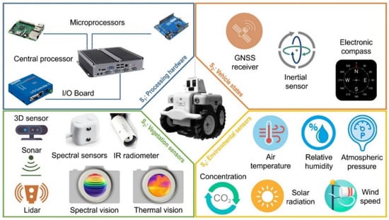 - S2-Vehicle states: In addition to making reliable measurements, the time-space circumstances around each individual measurement have to be unambiguously determined; without them, monitoring is useless. The most obvious—and critical—piece of information will be the time and global position for each point registered, but the monitoring velocity or the orientation of the vehicle is usually valuable information to know when the vehicle stops, moves in slope, or needs to scan the sunny and shaded side of the canopy separately.
