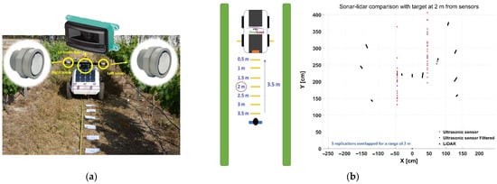 Figure 1 evidences the advantages of knowing the precise location of vegetation and Equation (1) shows the need of estimating the distance between the GNSS antenna and the canopy. This distance becomes available when the distance (SR) between the monitoring vehicle and the targeted canopy can be measured in real time. Among the diverse sensors capable of estimating distances, ultrasonic sensors (or sonar sensors) and lidar rangefinders present significant advantages for agriculture: their range scope is favorable to proximal sensing, usually up to 5–8 m; cost is, generally speaking, moderate in comparison to other sensing technologies, say up to $1500 for one lidar or three ultrasonic devices; and environmental protection rates of at least IP-65 grant long-term performance in outdoors conditions, which is essential for crop monitoring. Each technology presents different advantages. Ultrasonic sensors are less costly, but as the sound wave propagates in a cone, a network of various devices is needed to cover a vegetation region when various measuring points are necessary. Lidar rangefinders, by contrast, output several measurements at a time and with higher accuracy than sonar. The scouting robot in Section 3 features an ultrasonic sensor facing right side rows to apply Equation (1). For this situation (Figure 1a), one distance (SR) at a time is sufficient and the sonar sensor can be a good match, but when several distances have to be acquired simultaneously, a deeper analysis is recommended. Figure 3 shows the comparison of ultrasonic and lidar sensors in field conditions [20]. Figure 3a outlines the experimental setup, where two ultrasonic sensors separated 0.8 m and an 11-ray lidar placed between them tried to detect a person located 2 m ahead, just in front of the lidar head. Figure 3b depicts the results, which yielded very stable readings for the lidar (small black clusters, the three in the middle representing the standing person) and more dispersion for the sonars. The unfiltered sonar readings (red dots) were very noisy, and, although the filtered signal decreased dispersion (blue dots), accuracy was always inferior to that registered with the lidar. Nevertheless, as sonar and lidar are based on different principles, they can bring complementarity to the solution in terms of redundancy; the reflective properties of leaves influence the response of sonar sensors, but canopy gaps may let the narrow beams of lidar pass through without hitting any leaf.
