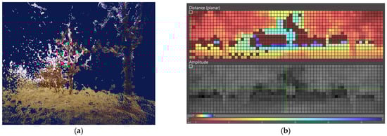A real-time assessment of canopy volume allows the estimation of growth and vigor, which is important for some crops such as grapevines, as well as for the variable-rate application of products, especially fertilizers and chemicals for pest and disease control. The detection of canopy gaps or high variability in tree size within a field plot may result in important product saving, and also in significant environmental benefits. There exist several devices and techniques capable of quantifying canopy volume [21]. For agricultural applications and environments, this measurement has been lately pursued using two approaches: (1) integrating consecutive 2D canopy profiles to obtain the 3D model of vegetation and thus estimate its volume; and (2) directly calculating the volume of a 3D point cloud rendering tree vegetation in real time. The first alternative, based on a 2D profile of canopy, has been attempted with a network of ultrasonic sensors or with a lidar rangefinder (Section 2.2.2). The second approach, which involves acquiring the 3D representation of reality in real time from a point cloud, can be embodied with stereoscopic cameras or with time of flight (TOF) sensors. Stereoscopic vision [22] typically produces higher resolution point clouds than TOF sensors, but the latter can be operated in the absence of light because they include their own illumination source. In terms of robustness, stereoscopic cameras tend to feature lower environmental protection rates. For example, the image in Figure 4b shows the range image of an olive grove taken with a TOF sensor of resolution 16 × 64 and rated IP-67. Figure 4a, by contrast, depicts a 3D point cloud of trees taken with a binocular stereoscopic camera of resolution 400 × 300 and no IP rating.