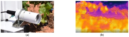 Non-invasive monitoring of canopy temperature: (a) infrared radiometer (Apogee Instruments, Inc., Logan, UT, USA); and (b) thermographic images of a vineyard from a terrestrial vehicle (FLIR Systems, Inc., Wilsonville, OR, USA).