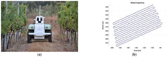 Acquisition of massive data from a vineyard: (a) autonomous robot for map generation in season 2020; and (b) trajectory traced by the monitoring robot in Map C (Table 1).