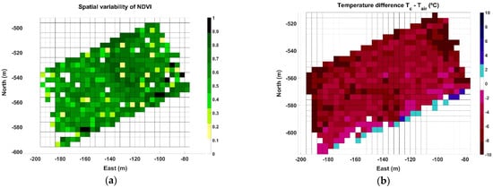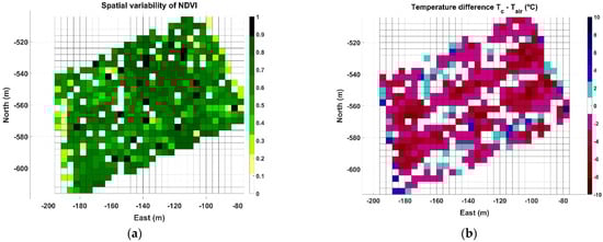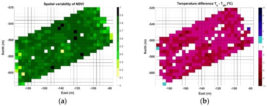 Grid maps for Map A field data: (a) spatial distribution of NDVI; and (b) ∆T (°C).