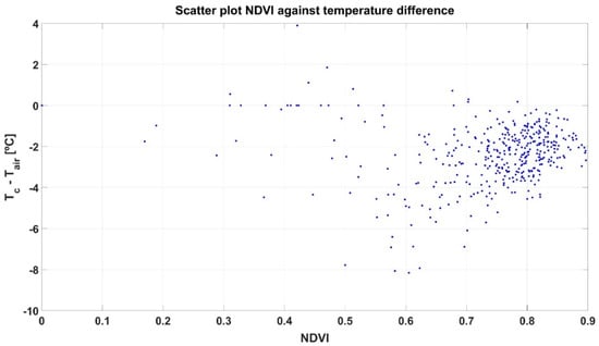 While the two grids in Figure 8 are quite visual and highlight spatial differences, we should relate them to reach deeper insights before attempting to cluster cells into harvesting zones. Figure 9 shows a scatter plot that merges the information contained in both grids, where the abscissa axis represents the NDVI calculated for each cell, and the ordinate axis shows the temperature difference ∆T. The plot reveals a high concentration of cells agglutinated around NDVI ≈ 0.8 and ∆T ≈ −3 °C.