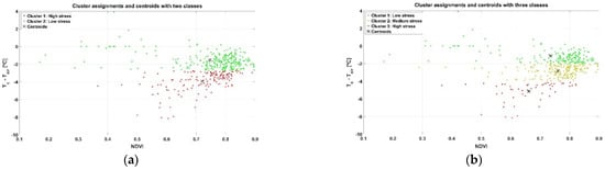 Clustering results and centroids for Map A: (a) two classes (k = 2); and (b) three classes (k = 3).