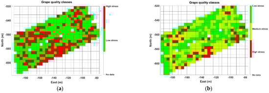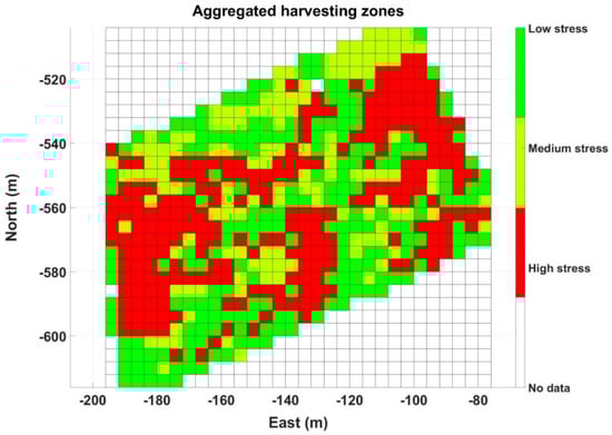 The three NDVI grid maps estimating vigor for Maps A (Figure 8a), B (Figure 12a), and C (Figure 14a) are consistent in outlining a strip of higher vigor, which also coincides with a high ∆T, either positive or small negative. This, a priori and in advance of a deeper analysis, already reveals signs of an area of lower hydric stress, and therefore distinct properties expected in the grapes. The concluding maps at the time of making a decision, however, are those featuring stress zones (Figure 11b, Figure 13b and Figure 15b). The three maps contain zones that are consistently labeled as high stress, mainly in Maps A and C. However, Map B in particular, the one with the hardest ambient conditions, also highlights specific rows from headland to headland. To ease interpretation, the three zoning maps can be packed up into one, such that every cell retains the highest stress value out of the three final maps (A–C) if it is labeled as high stress at least in one of them. Otherwise, if the cells are labeled as low or medium stress, the final value assigned is low stress, with the purpose of reducing the population of medium stress cells, and thus decreasing map variability to facilitate the sorting of cells into two operative classes. Figure 16 depicts such an aggregated map.