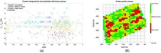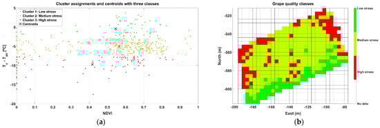 The zone map in Figure 11a offers a balanced distribution of cells for k = 2 (two zones). However, being demanding in terms of highly distinctive wine traits implies considering only those zones where there is a high likelihood of finding properly control-stressed vines. As a result, the subsequent analysis systematically considers three classes when clustering (k = 3), and therefore three harvesting zones, with the purpose of isolating highly stressed vines and combining low-medium stress in another zone. Figure 13a provides the results of the k-means clustering with its found centroids, while Figure 13b plots the resulting three zones in grid format.