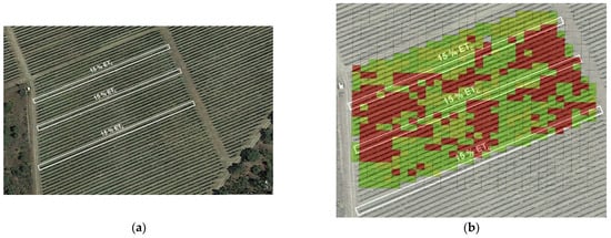Monitored vineyard: (a) satellite image with deficit irrigation lines; and (b) potential correlation between low-irrigated rows and high stress deduced from the aggregated zoning map in Figure 16.