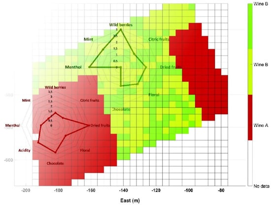 The aggregated map in Figure 16 inherits several full rows of high stress from Map B (Figure 13b). According to Figure 17b, these high stress rows approximately replicate the lines under deficit irrigation, which makes sense because the ambient conditions when the map (B) was taken were actually hard, and water deprivation with temperatures of 40 °C and above is prone to create certain stress in plants. The match is not exact, however, because not every row was mapped (traversing alternate rows and measuring only on the right side results in skipping some rows) and the cell size of 4 × 4 somewhat merges some consecutive rows. It would have been more revealing to maintain blocks of at least six adjacent rows with the same irrigation pattern. Nevertheless, in regular production conditions, all rows will get the appropriate water rate, and stress will be determined by other physical properties of the plot such as elevation, orography, and soil, in addition to atmospheric conditions. With these premises, the aggregated map in Figure 16 was simplified to represent two homogeneous zones in which differential harvesting can be applied in practice, as illustrated in Figure 18. These two zones approximately coincide with the wine-making practices followed in this vineyard; microvinification and wine tasting sessions undertaken along the VineScout project revealed distinct properties for the wines coming from the vigor strip zone and from the central-west area, as indicated in Figure 18. The aroma ratings of the two wines shown in the figure below belong to the 2018 harvest that was microvinified in 2019 (the grapes of 2019 season had to be microvinified in 2020, but, due to restrictions derived from the COVID-19 pandemic, this laboratory work was suspended), but it provides end-users with a reasonable expectation for upcoming seasons. These ratings prove that the final traits are distinct for each zone; it will be up to the customers to decide which option better fits their palates (and their pockets). This is, indeed, the final stage of the data-driven recommendation. Now, it is the grower’s turn to make the final decision, based—or not—on the harvesting map in Figure 18. For such decision, other circumstances such as harvesting costs, the availability of a combine harvester versus pickers, and other winery logistics, for example, may exert a significant weight on the ultimate decision.