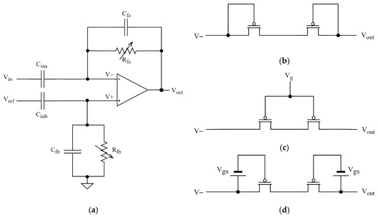Due to silicon area restrictions, the Cin is typically in the range 5–20 pF and the Cf capacitance is typically in the range of tens to hundreds of fF. The feedback resistance in the TΩ range is necessary to achieve sufficiently large time constant. Such a resistance is realized by transistors connected in diode configuration [15] (Figure 1b) or in subthreshold mode that allows one to tune the channel resistance value by changing the gate voltage [16,17,18] (Figure 1c). Such tuning allows the user to control the cutoff frequency of the high-pass filtering and to find—for specific experimental conditions—the optimal compromise between the two requirements: