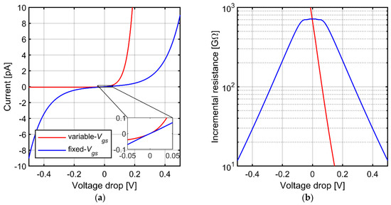 (a) Simulated current-voltage relationship for variable-Vgs and symmetric fixed-Vgs pseudoresistors (b) Incremental resistance for both implementations.