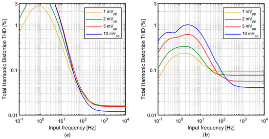 It is expected that the large difference in the linearity of the I-V characteristics for the variable-Vgs and fixed-Vgs pseudoresistor configurations is reflected in the nonlinear distortions of the complete AC-coupled amplifier processing an AC signal. In particular, one can suspect that highly nonlinear I-V characteristic for the variable-Vgs pseudoresistor configuration should result in very high distortion, making this configuration impractical for amplification of signals up to 10 mVpp. To evaluate these effects, we used Spectre transient simulations (Cadence Design Systems, San Jose, CA, UAS) to find the THD-vs-frequency curves for the AC-coupled amplifier (Figure 1a) using the standard tunable and improved tunable pseudoresistor configurations (Figure 1c,d, respectively). The operational amplifier and capacitors Cin and Cf used in these simulations are ideal elements, therefore the only source of nonlinearity is the pseudoresistor in the feedback loop. Transistor models for 180 nm PD‑SOI technology were used for the pseudoresistor.
