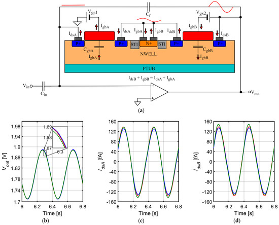 A simplified model of the feedback loop for the fixed-Vgs pseudoresistor is shown in Figure 4a. Since the transistors are biased in the deep subthreshold region the gate capacitances are practically equal to the gate-bulk capacitances. These capacitances are not perfectly linear and depend on the Vgb voltage. The AC current Igb is present in both transistor B (current flow between the output of the amplifier and the common bulk of both transistors) and transistor A (current flow between the common bulk and the external voltage source Vgs1—Figure 4a). We note that if the gate-bulk currents were identical for both transistors, all the AC current flowing from the output of the amplifier to the gate of transistor B would go to the external voltage source Vgs1. This would be equivalent to additional capacitive load of the amplifier output with no impact on the impedance of the feedback loop, therefore, no impact on THD. However, closer examination of the simulation results shows that the effect is more complex.
