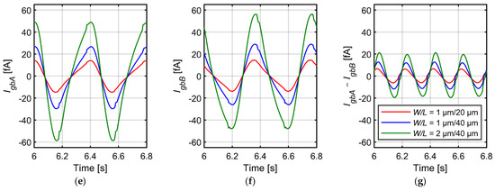 In order to confirm that the gate capacitances indeed contribute significantly to the impedance of the feedback loop we show in Figure 4 the results of transient simulations for a sinewave signal of 2.5 Hz for three different sizes of transistors composing the pseudoresistor. The cutoff frequency for each size of transistors was set at 1 Hz by tuning of the Vgs value. The plots show the output voltage, the drain-source currents and the gate-bulk currents for transistors A and B. As expected, the gate currents scale linearly with the gate area. The current is driven by the AC component of the gate-bulk voltage, which is equal to Vb–Vref for transistor A and Vout–Vb for transistor B. Since the Cgb also changes with Vgb, the Igb is not linear function of Vgb and it must include harmonics of the base frequency of the signal. As visible in Figure 4 the harmonics for transistors A and B are similar in amplitudes but different in phase (Figure 4e,f), and the differential current IgbB–IgbA includes almost entirely the harmonic frequencies (with very low component of the base frequency—Figure 4g). It means that while the base frequency component of the IgbB current flows in almost 100% through CgbB and CgbA to external voltage source Vgs1, the current path for the harmonic components of IgbB closes via the drain-source resistances of transistors A and B. As a result one should expect the increase of the THD values. This effect will be reduced for very low frequencies—where the gate currents become very small compared with drain-source currents—and for frequencies much above the cutoff frequency, where the feedback loop impedance becomes dominated by Cf. For the amplitude of 10 mVpp the nonlinear gate currents result in second maximum in the THD curve located at ~2.5 Hz and become the dominating source of distortion. For smaller amplitudes these two maxima overlap.
