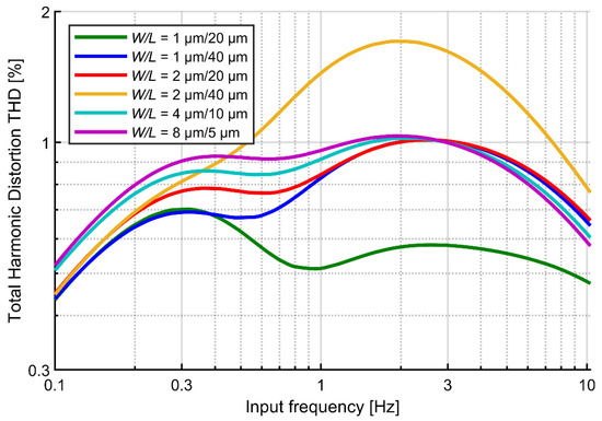 The contribution of gate current to the circuit distortion is expected to scale with the gate area of transistors A and B. Figure 5 shows the simulated THD value as a function of input signal frequency for various sizing of the transistors and large signal amplitude (10 mVpp). As expected, the height of the second peak (at 2–3 Hz for different curves) scales with the product W × L; in contrast, the first peak is associated with the nonlinearity of the I‑V curve (at ~0.3 Hz) scales with the transistor channel length. These observations may lead to a conclusion that reducing the gate area of transistors forming the pseudoresistor is a way for reduction of the THD. However, we note that excessive reduction of the gate areas may result in significant mismatch of transistors A and B and disturbed symmetry of I-V curve for positive and negative voltages. This would lead to increased THD values. For this reason, we accept the gate width W = 1 μm and length L = 40 μm for the following analyses.