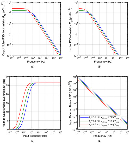 In Figure 7a we present the PSDs of the noise contributed by Rfa. The PSDs are shown at the amplifier output for various values of the cutoff frequency of the AC-coupling circuit. Although the tuning does not change the total rms noise, it shapes the noise spectrum. Therefore, the noise in the frequency range of interest can be reduced by shifting the cutoff frequency below this range; this is discussed in more detail later in this section.