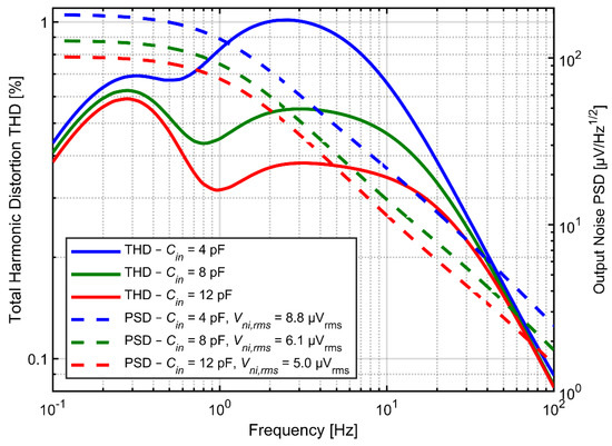 Figure 8 shows the noise PSD and the THD as a function of input signal frequency for various values of Cin and Cf but at fixed ratio Cin/Cf = 20. Both the noise and distortion performance benefit from larger capacitors. Increasing the Cf determines proportional decrease of the feedback resistance if the time constant of the high-pass filter is not expected to change. Obviously, the total current in the feedback loop increases proportionally to the increase of capacitors. The same applies to current in capacitor Cfa as well as to the drain-source currents of transistors forming the pseudoresistor (the ratio of drain-source current to current in Cfa for given frequency does not change, since we assumed that the time constant did not change). At the same time the gate currents for transistors A and B (Figure 4a) do not change (as both the gate capacitances and the gate-to-bulk voltages for these transistors do not change). In consequence the influence of the current IgbB–IgbA on the drain-source currents is reduced and the second peak in THD curves decreases, according to analysis presented in Section 3.3. On the other hand, increasing of Cfa and Cina results automatically in reduction of thermal noise across both resistors Rfa and Rfb.