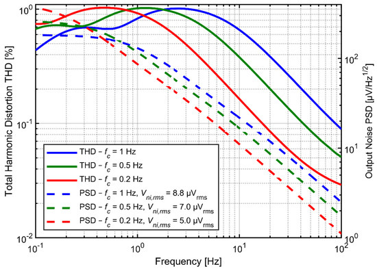 Tunable AC coupling circuit provides the opportunity to shape the spectrum of noise and distortion. One can shift the maxima of the THD curve out of the frequency range of interest by lowering the cutoff frequency (Figure 10). However, the low frequency signal components can still generate harmonics leaking into higher frequency range and can modulate higher-frequency signals due to circuit nonlinearities. It is therefore difficult to analyze the profit of the cutoff frequency decrease on the output signal distortion without knowing the spectrum of the input signal, and in particular, the power of very slow (out‑of‑band) oscillations of the electrode voltage. The positive effect of lowering the cutoff frequency on the noise measured above 1 Hz is straightforward, as shown in Figure 10.