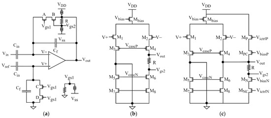 Three alternative approaches to remove the electrode offset have been proposed. First, a high-pass RC filter can be used to remove the DC voltage at the input of the amplifier that works without feedback loop [14,20]. This solution has worse noise performance than the circuit shown in Figure 1a, since the thermal noise source from the large resistance is located directly at the amplifier input. The rms (root mean square) value of noise can be minimized by setting the cutoff frequency to very low values—much below the frequency range of interest [20]—but this would compromise on filtering out very slow signals, as discussed previously. As a result, open-loop neural amplifiers use larger input capacitors (20 pF and more) to improve the signal-to-noise ratio (SNR). This comes at the cost of increased area, which is not optimal for systems with high channel counts.