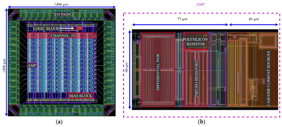 (a) Layout of the test integrated curcuit; (b) Layout of the preamplifier for the test chip. The elements inside the orange rectangle include the cascode transistors (MP, MPC, MNC, MN—compare with Figure 11c) and an output buffer; these blocks will not be included in the final preamplifier design shown in Figure 11b. The layout of the preamplifier is 118 μm × 60 μm (77 μm × 60 μm for the final design).