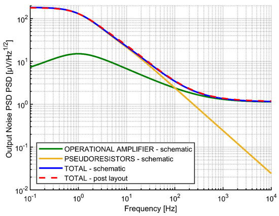 Output noise PSD for pseudoresistors and operational amplifier.