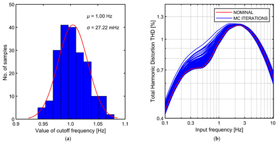 Results of Monte Carlo simulations of complete AC-coupled preamplifier: (a) Spread of the cutoff frequency; (b) Spread of the THD versus signal frequency characteristics.