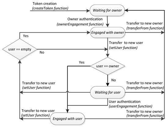 An IoT device is a dynamic asset that can change of operating modes, which can be represented by states. In particular, the states defining if the device has been engaged or not with an owner or with a user deserve attention because the software to be executed by the device, which should be verified prior to be executed, is different. Hence, we propose the addition of the NFT attribute state and propose that the operating mode of the device should be in correspondence with its token state. We consider four main states of the token. The state Waiting for owner defines the situation whenever the token is created or transferred to a new owner, but the device and owner have not yet been mutually verified. Once they verify each other, the device recognizes its owner and the state of its token changes to Engaged with owner. In this state, the owner can transfer the token to a user. If the token is transferred to a user that coincides with the owner, the token state changes to Engaged with user and the device is ready to operate in its application, obeying the commands from its user. Otherwise, the token changes its state to Waiting for user. Once the user and the IoT device are verified mutually, the token changes its state to Engaged with user. From this state, the token can be transferred to another user, thus returning to the Waiting for user state. To cope with a user that cannot reply, the token can be transferred to another user if its state is Waiting for user. From all the states, the token can be transferred to another owner, thus returning to the Waiting for owner state. Figure 1 illustrates the state diagram of the token. The state changes are controlled by token functions as explained in the next subsection.