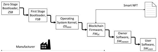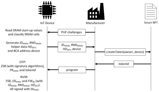 It is assumed in this work that the SoC (system on a chip) acting as the processing core of the IoT device contains a small one-time programmable (OTP) memory, e.g., a ROM, and a larger non-volatile memory (NVM), e.g., a flash or SD card. The manufacturer writes a very small piece of data and code (the zero-stage bootloader ZSB, the manufacturer public key PKMAN, and the tokenId) in the OTP memory and most of the data and code (the first-stage bootloader FSB, the kernel of the operating system OSMAN, and the firmware needed to interact with the blockchain FWBC, including the IDMASK, RNDMASK, and HDDEV) in the NVM. Since the NVM is not tamper-proof, all the data stored in it are signed with the manufacturer private key SKMAN. In the OTP memory, the tokenId is stored, since it represents the logical and immutable identity of the smart NFT associated with the device. In addition, the zero-stage bootloader is stored together with the manufacturer public key PKMAN and the code needed to verify the signatures.